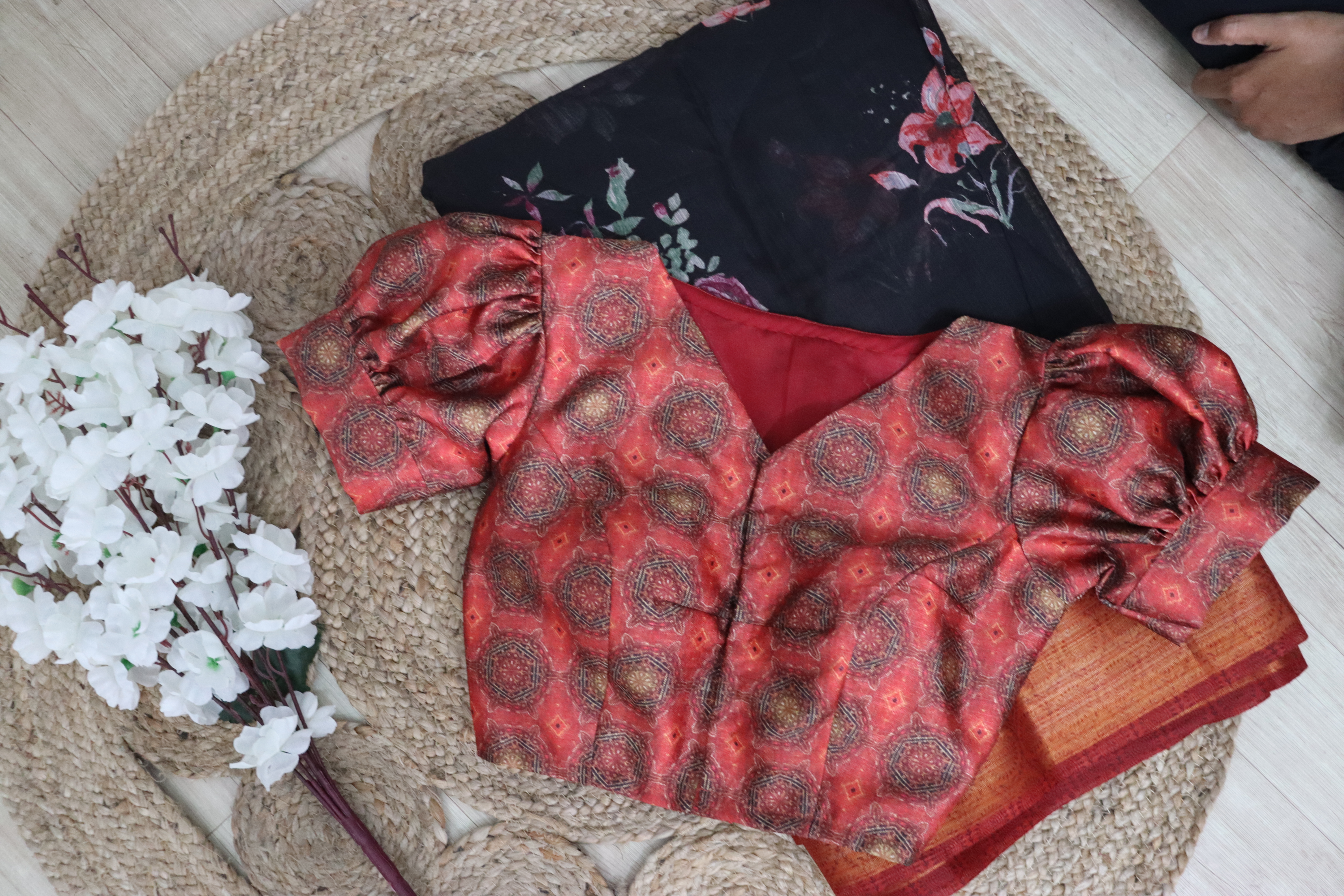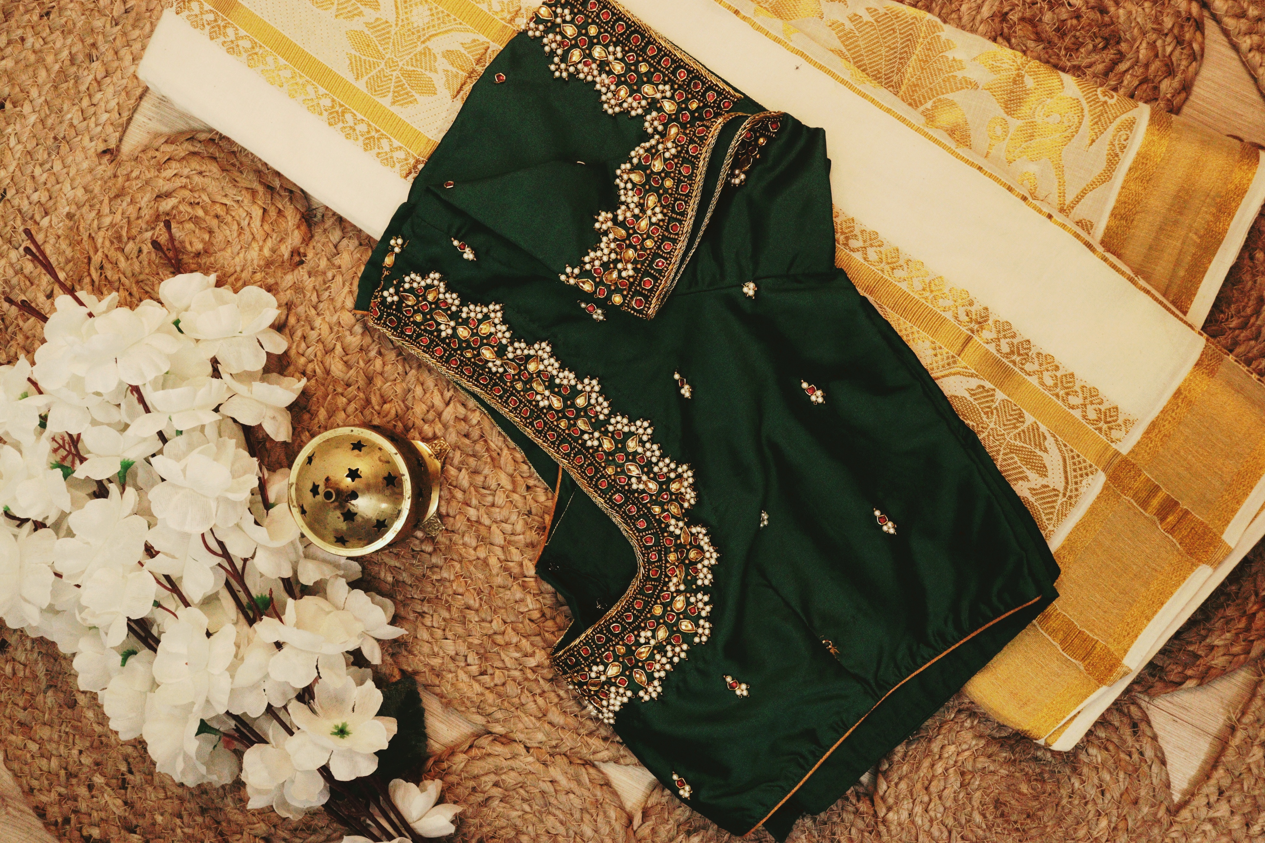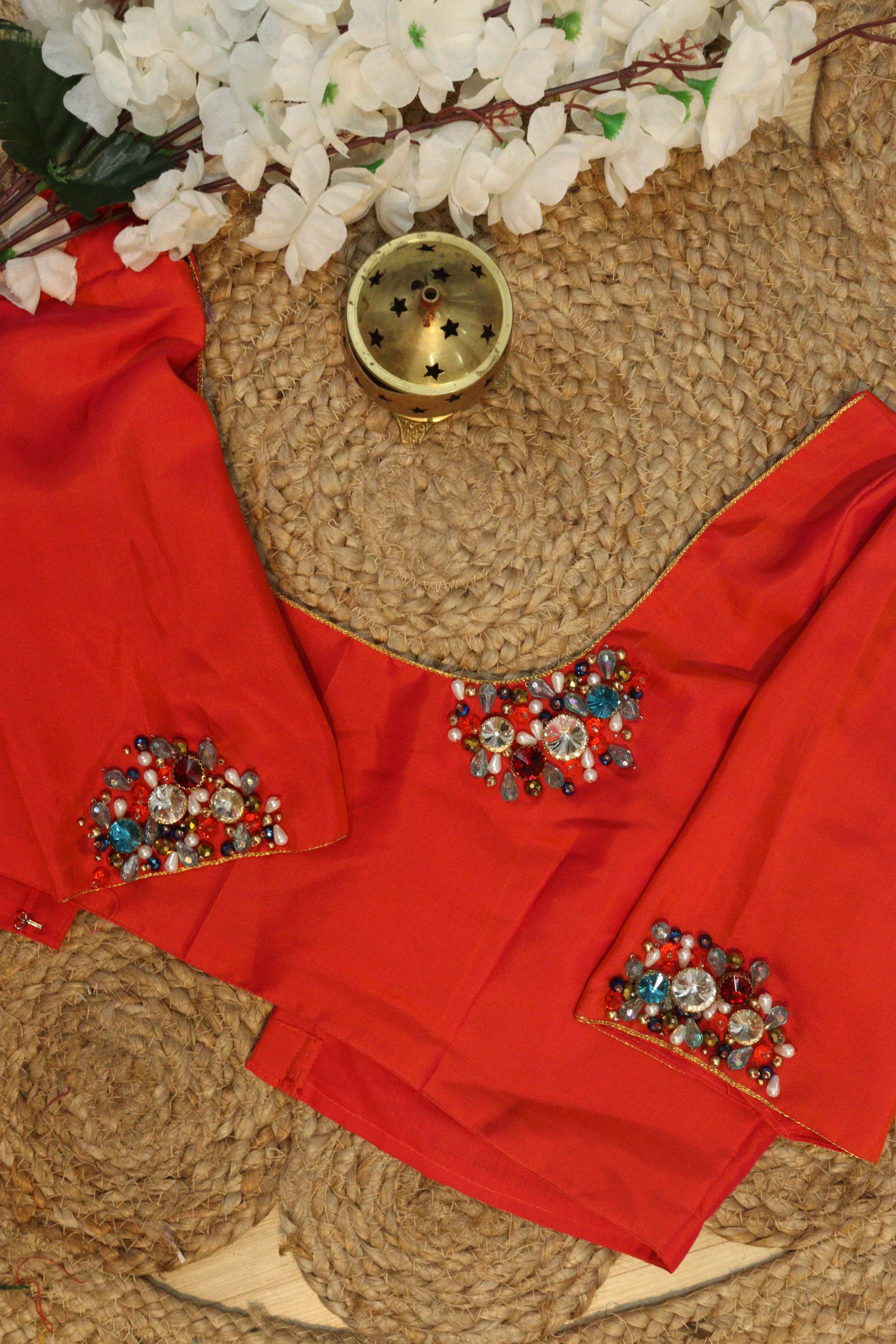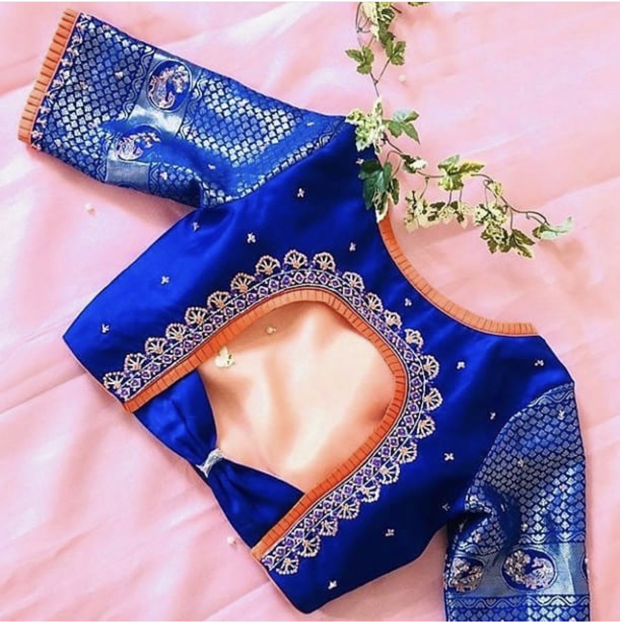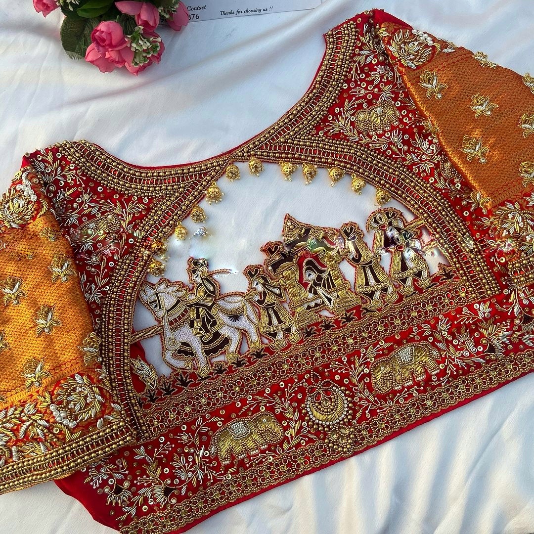 "Indulge in the beauty of Aari embroidery. Our blouses are a testament to the skill and dedication of artisans." 🌟🧡